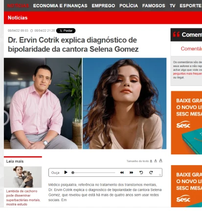 Dr. Ervin Cotrik explica diagnóstico de bipolaridade da cantora Selena Gomez